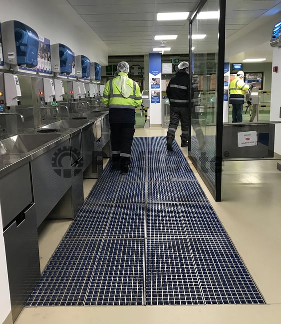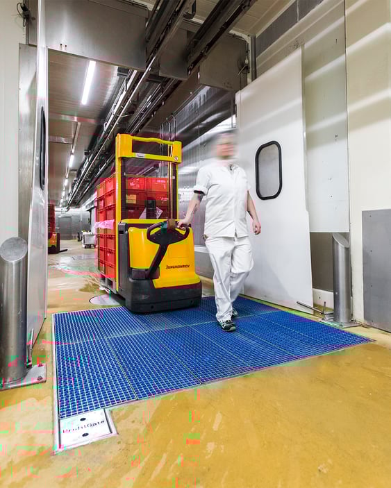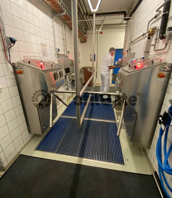 Le sas d'hygiène ProfilGate® au niveau du sol est conçu comme une zone de passage propre pour le nettoyage humide et la désinfection des pneus, des roulettes, des roues et des semelles de chaussures. Le matériau est inoxydable et donc idéal pour les domaines où les exigences en matière d'hygiène sont élevées, comme l'industrie alimentaire, les entreprises chimiques et pharmaceutiques.