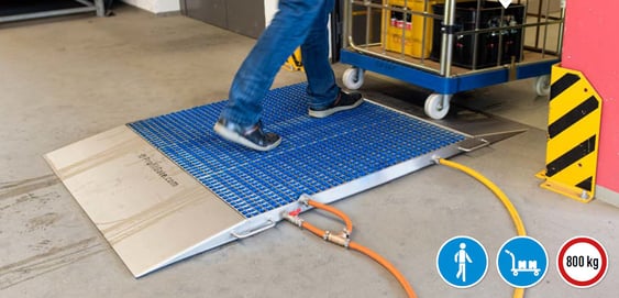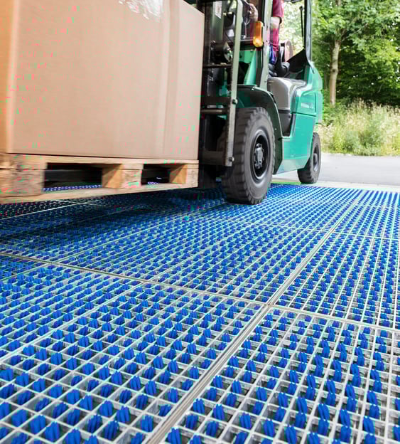 Le système de nettoyage est installé à l'entrée des halls de production et de stockage. Lorsque les véhicules passent sur les zones de propreté, le système élimine mécaniquement et en temps réel la saleté qui adhère aux pneus, aux roulettes et aux roues des chariots de manutention.