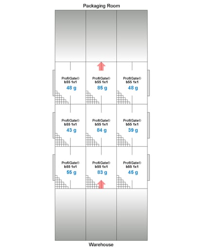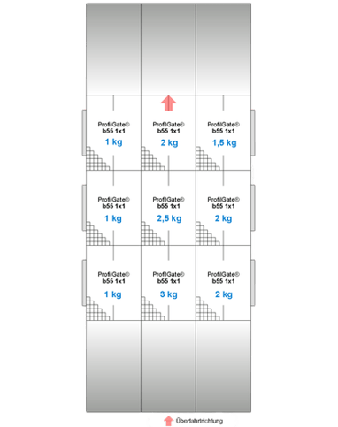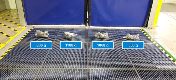 On voit ici les sacs de saleté avec la quantité de saleté collectée dans chaque voie de circulation. Comme les véhicules circulent au milieu du champ de nettoyage, la plus grande quantité de saletés a été collectée dans les voies centrales.